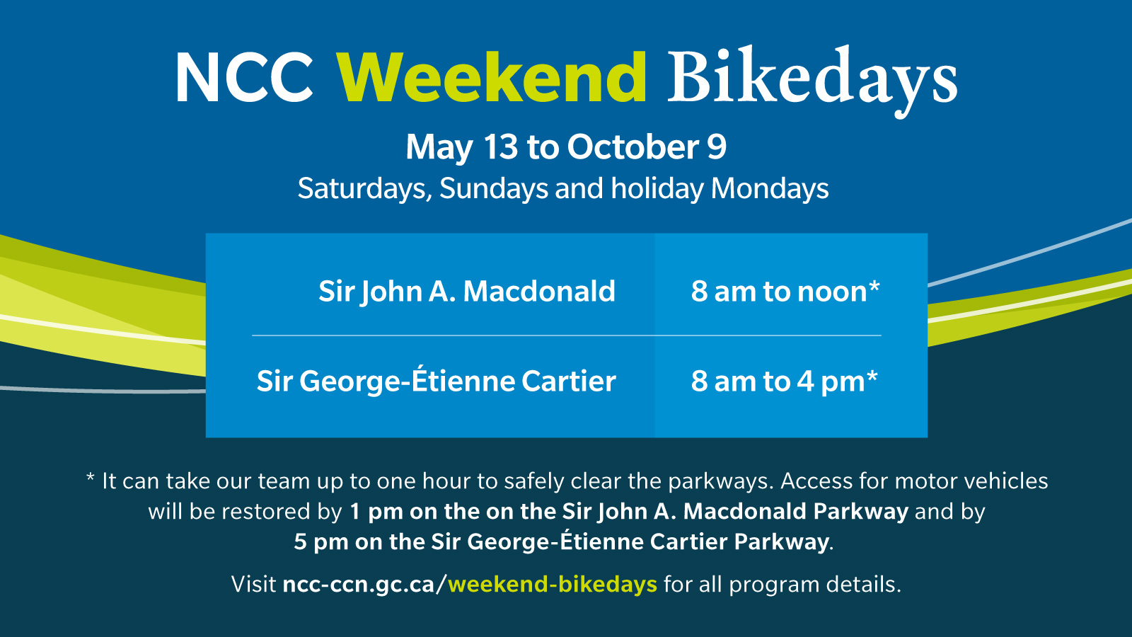 Weekend Bike Days May 13 – October 9, 2023 Organized by NCC Weekend Bike Days Register Organizer website See something wrong? You can fix it — every edit can be undone. Photos
