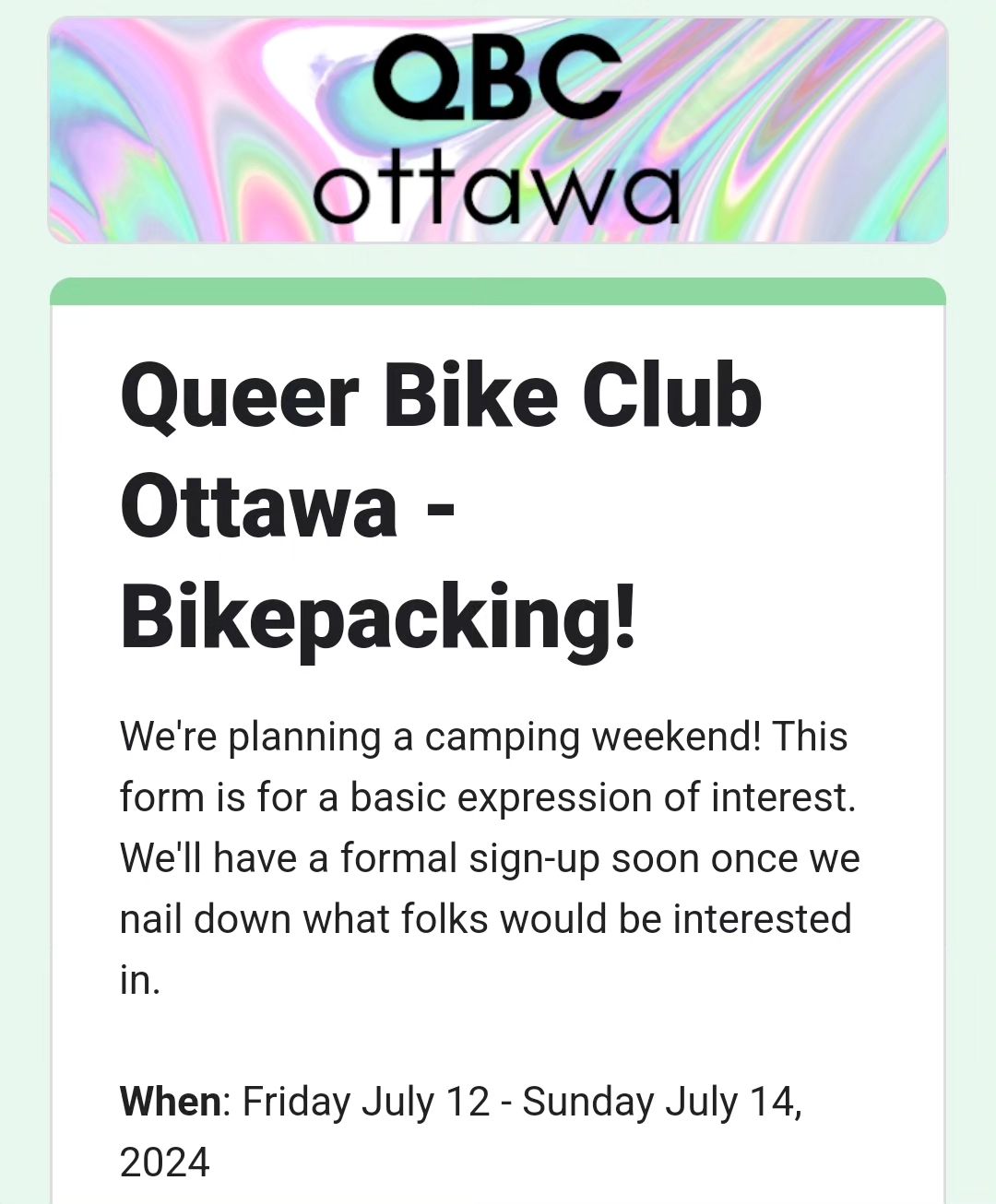 RegisterWe’re planning a camping weekend! This form is for a basic expression of interest. We’ll have a formal sign-up soon once we nail down what folks would be interested in. Leave downtown on Friday, early evening. Bike out to Wesley Clover Campground (about 25km on easy paths). Camp the night. Saturday has the option for a few different group activities. BBQ! Sleep another night. And then bike back downtown on Sunday morning.