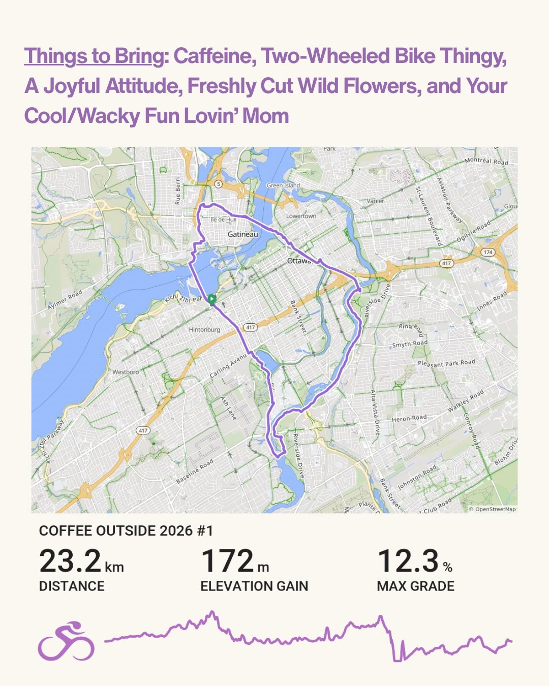 The Details: *Meet at Bayview Station at 10am (big blue onion) *Roll Out 10:15am *Coffee Time 11am-12pm *Back at Bayview for 1pm-1:30pm *Route subject to change Kitchissippi water levels